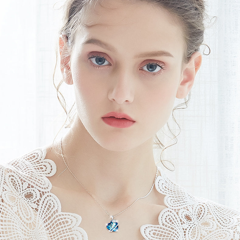 Diese wunderschöne Halskette lässt in das tiefe Blau des Ozeans blicken. Die Kette ist mit 5A Zirkonia Kristallen verziert und besteht aus 925er Silber. Das Herz besteht aus einem funkelndem Zirkonia Stein verziert mit einer schönen Kristall Blume.